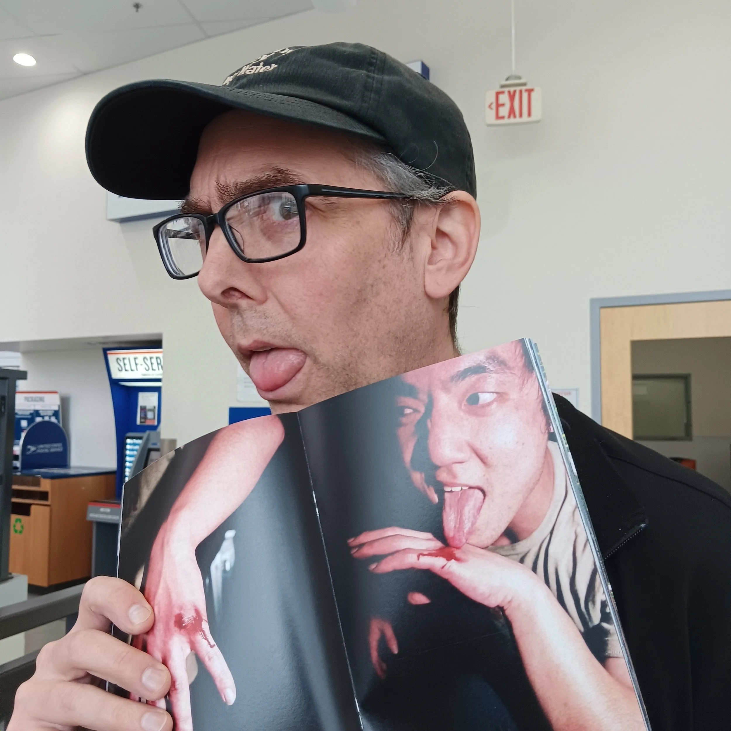 I got the package of zines this morning, and ran into Marat at the post office. He waited patiently for me to open the package so I could give him a copy of the zine, and then graciously posed with it as the “thanks Greg and Karoline” photo to include with the text. (that’s the below photo)